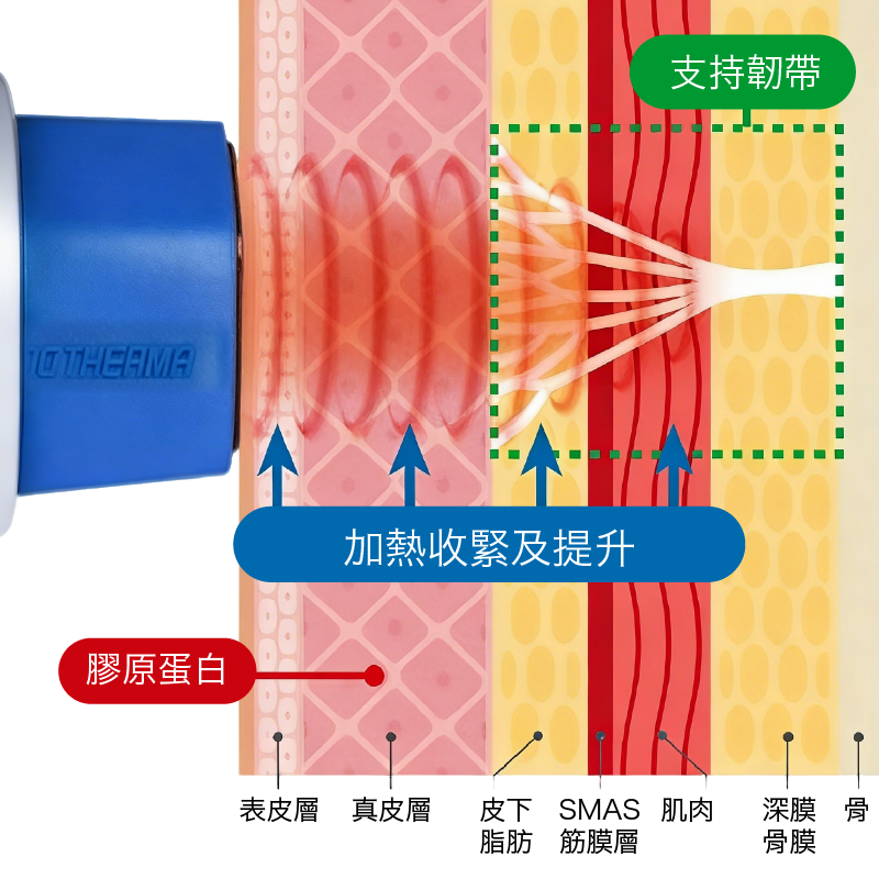 治療深度達4.3mm , 覆蓋整個真皮層 , 拉緊皮下支持韌帶 , 還原韌帶彈性 , 解決下垂、鬆弛、凹陷、皺紋等肌膚衰老問題。