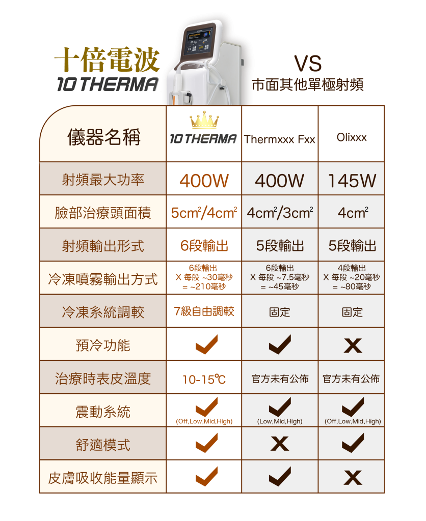 來自韓國的十倍電波,是一項非侵入式緊膚療程,全球最高功率FDA認證400W醫學級單極射頻,透過6.78MHz單極射頻技術和獨家5cm²大面積治療頭,,以3D式立體加熱全層皮膚 , 迅速收緊膠原蛋白 , 帶來即時的緊緻效果 , 並激活纖維母細胞 , 誘發膠原再生。