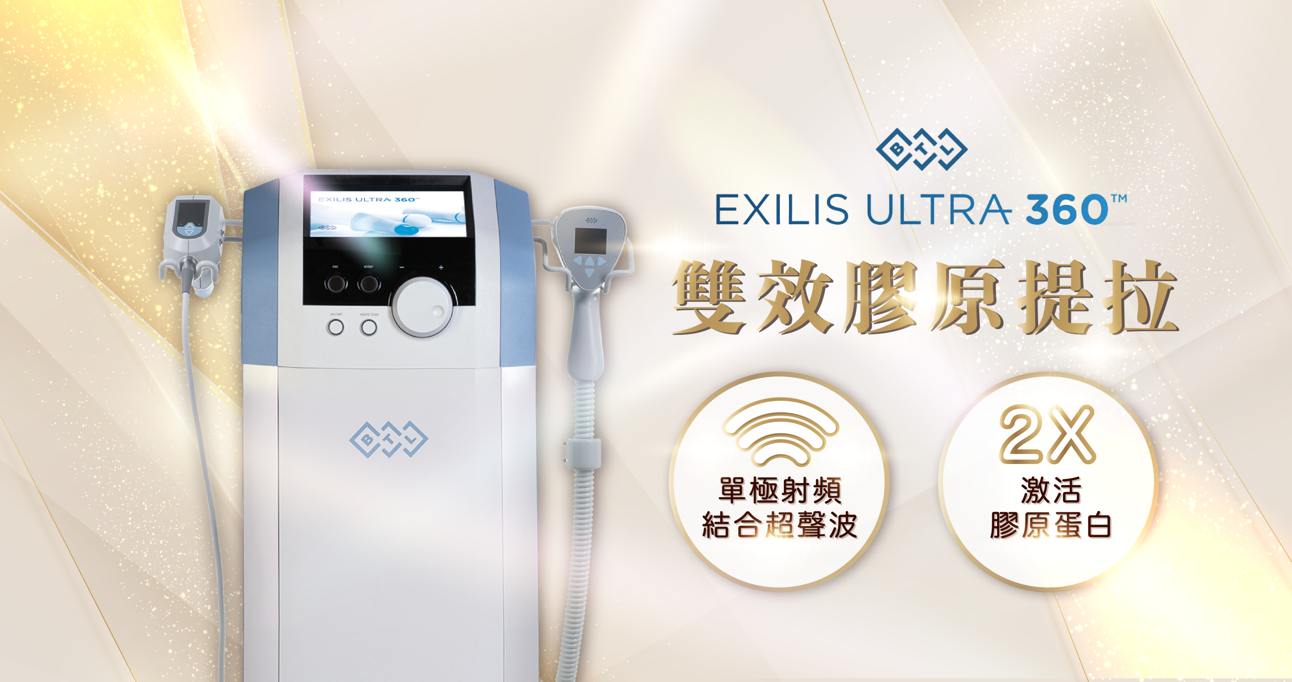 EXILIS Ultra 360以全球唯一超聲波結合單極射頻技術,榮獲FDA認證,利用360度環迴能量將熱能分層滲透肌底,使射頻從表皮層至脂肪層逐層滲透並加熱至46℃,刺激膠原蛋白和彈力蛋白增生,達到緊緻輪廓、撫平細紋、淡化黑眼圈、改善眼袋和局部燃脂塑形等效果,提供無創、無痛、無復原期的安全舒適體驗。